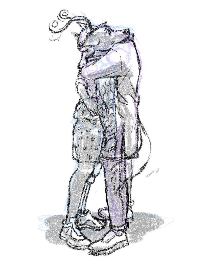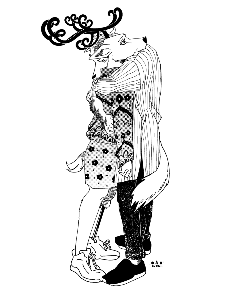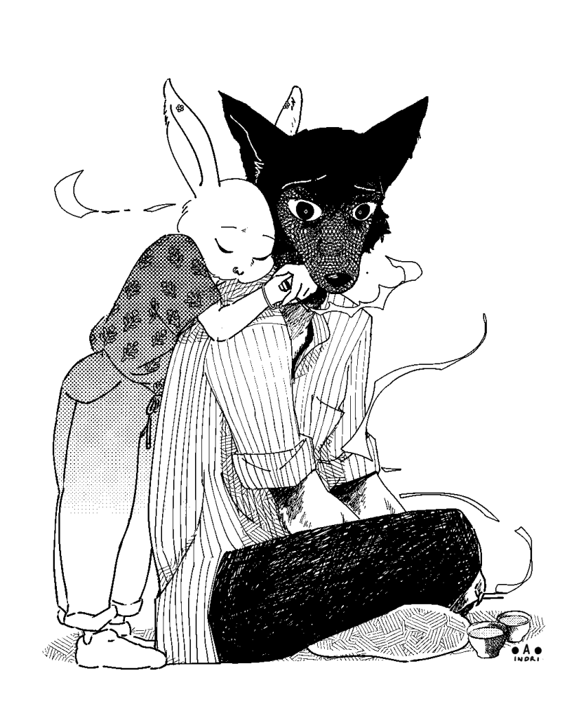 I watched Beastars and In Which Annie Gives it Those Ones back to back and made this crossover fanart with Legoshi, Haru, Louis as Indian public art college students- In Beastars, which starts in the drama club- Legoshi desperately wants to be one of the good ones, and starts off as a passive bystander while Annie as an architecture student is more idealistic and stubborn from the start.