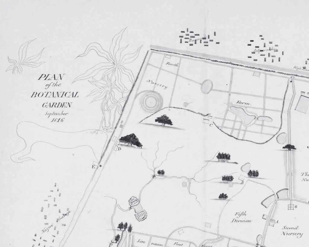In an attempt to render the garden “a botanical class book” its contents were organized into distinct compartments demonstrating systematic botany and the classification of plants. Writing several years later, Joseph Hooker described how “the avenue of Cycas trees (Cycas circinalis) once the admiration of all visitors . . . had been swept away by the same unsparing hand which had destroyed the teak, mahogany, clove, nutmeg and cinnamon groves”