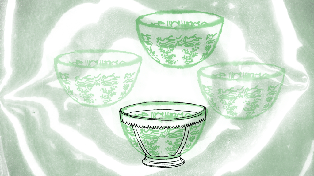Marbled paper-inspired by the techniques Suminagashi and Ebru– become the animated canvas on which objects are placed. Sometimes they represented maps, sometimes cracks in the porcelain. The journey of these pieces along the Silk Route mostly ended up as part of shipwreck at the bottom of the ocean. Many had precious metal handle and base added to them when they arrived in Europe thus changing their original function.